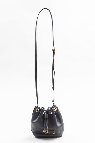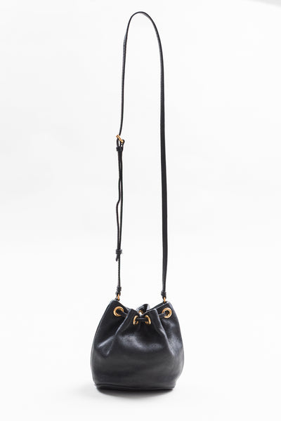 Black Leather Bucket Bag with Gold hardwear and long adjustable straps.