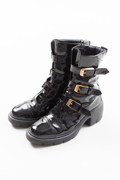 Patent Leather Combat Boot with Lug sole, buckles. Designer (new)