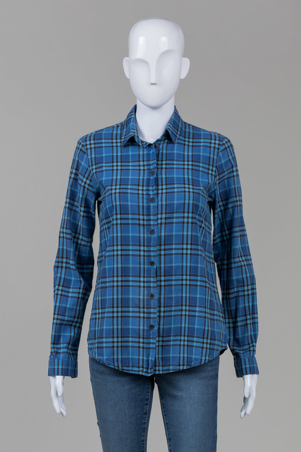BURBERRY Brit blue button front shirt w/ black & light blue plaid pattern (XS)
