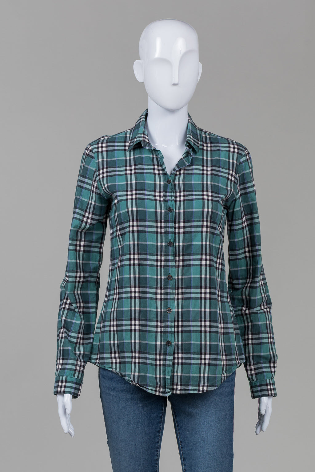 BURBERRY Brit green button front shirt w/ black and white plaid pattern (XS)