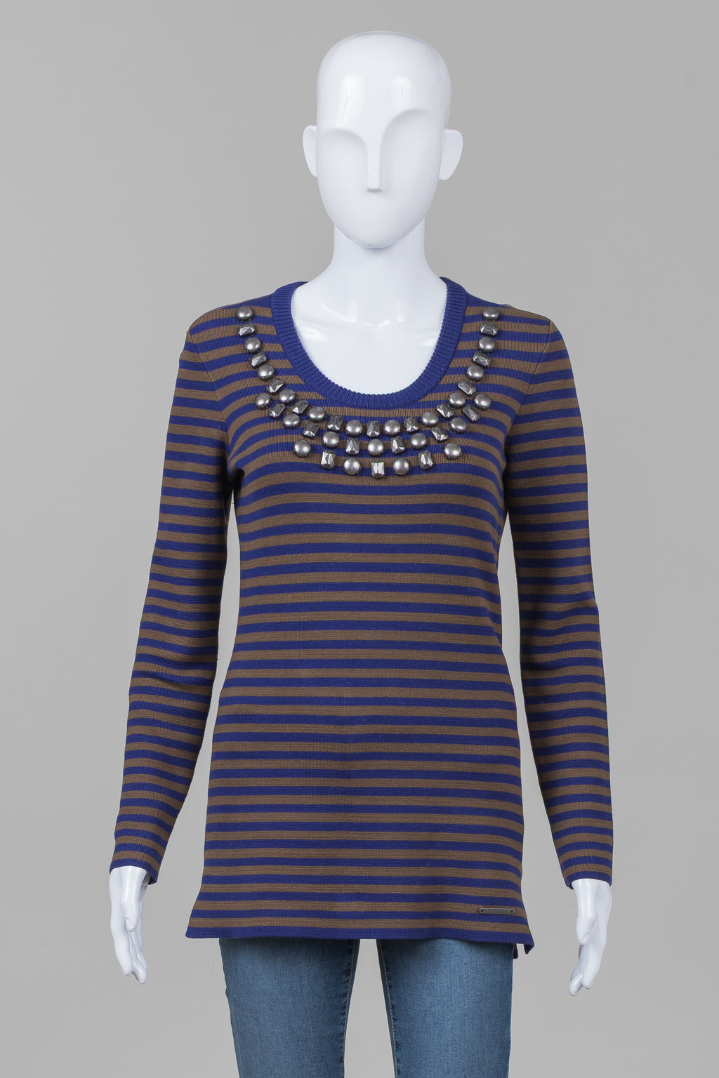 Burberry Brit royal blue & khaki striped scoop neck sweater with metal embellishment (S)