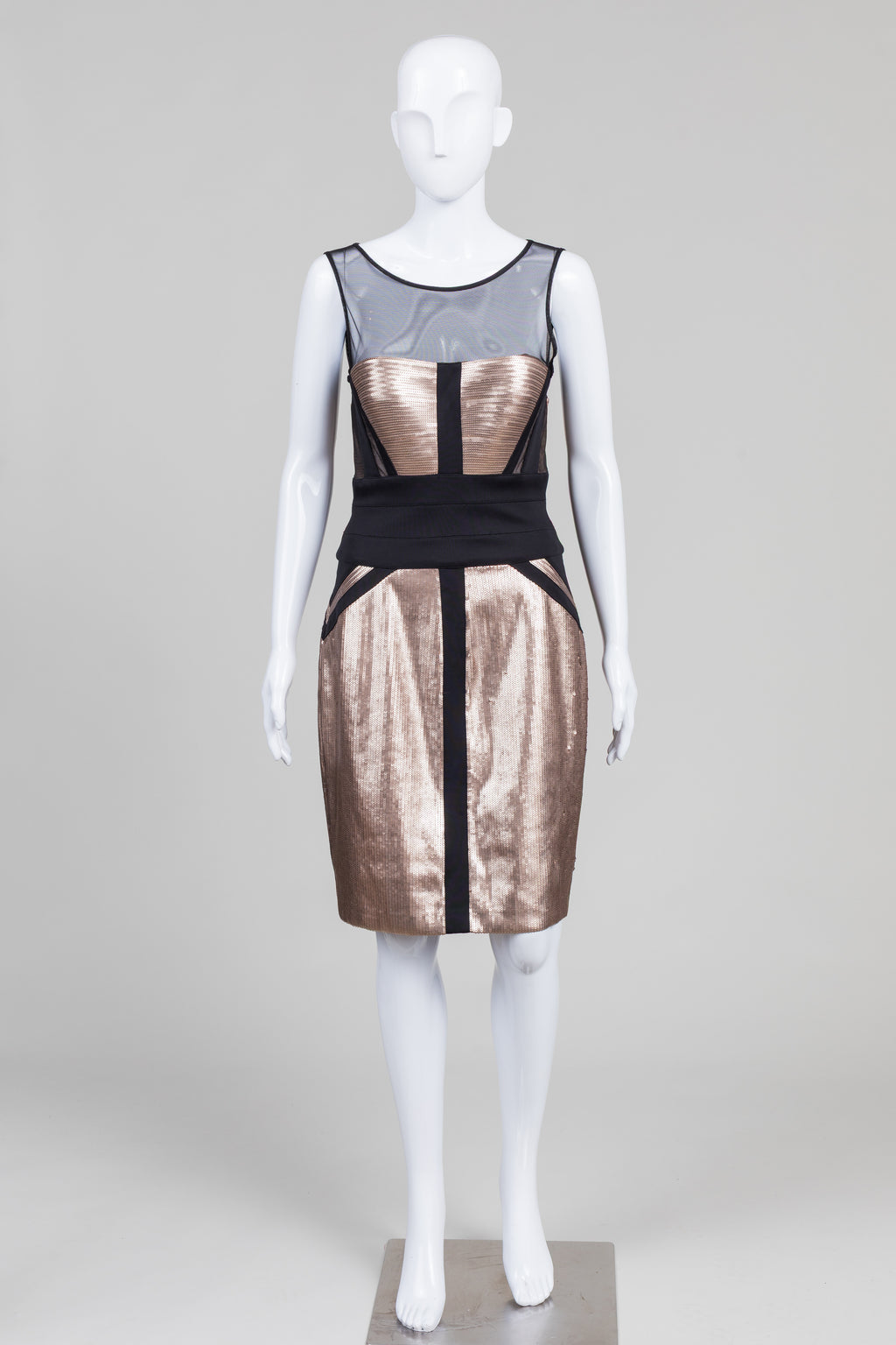 BCBGMaxAzria Rose Gold Sequin & Black Mesh Fitted Cocktail Dress (S)