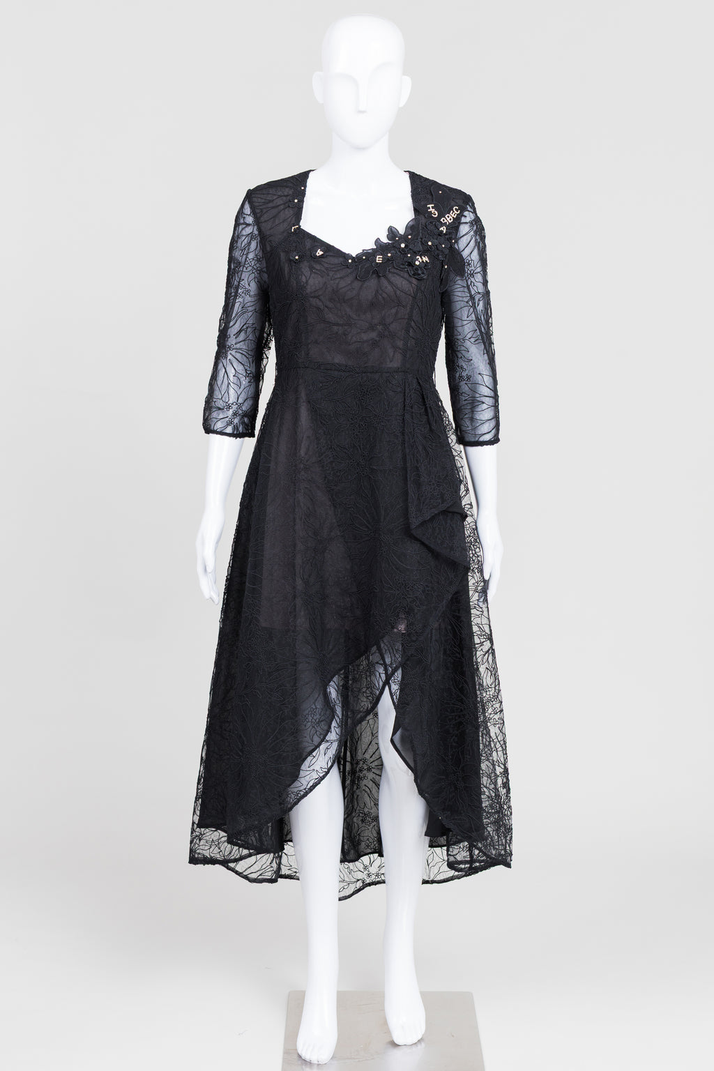 Siduo Garments Black Lace 3/4 Sleeve Fit & Flare Mock Wrap Dress (Asian 165/88) *New w/ tags
