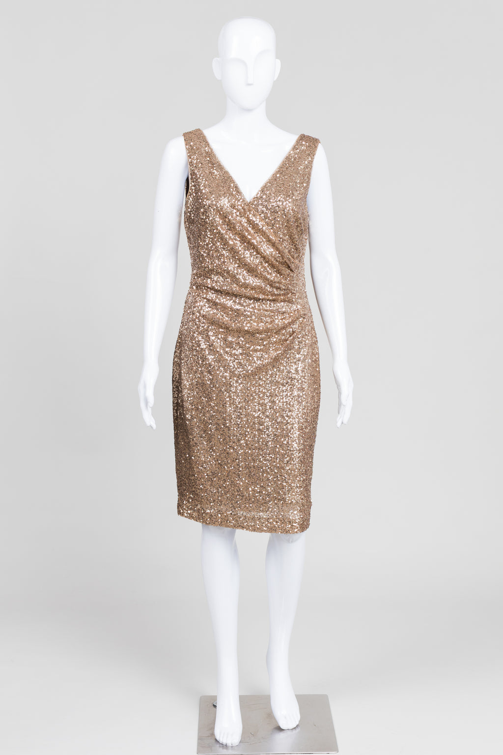 Lauren Ralph Lauren Gold Sequin Sleeveless Wrap Look Cocktail Dress (10)