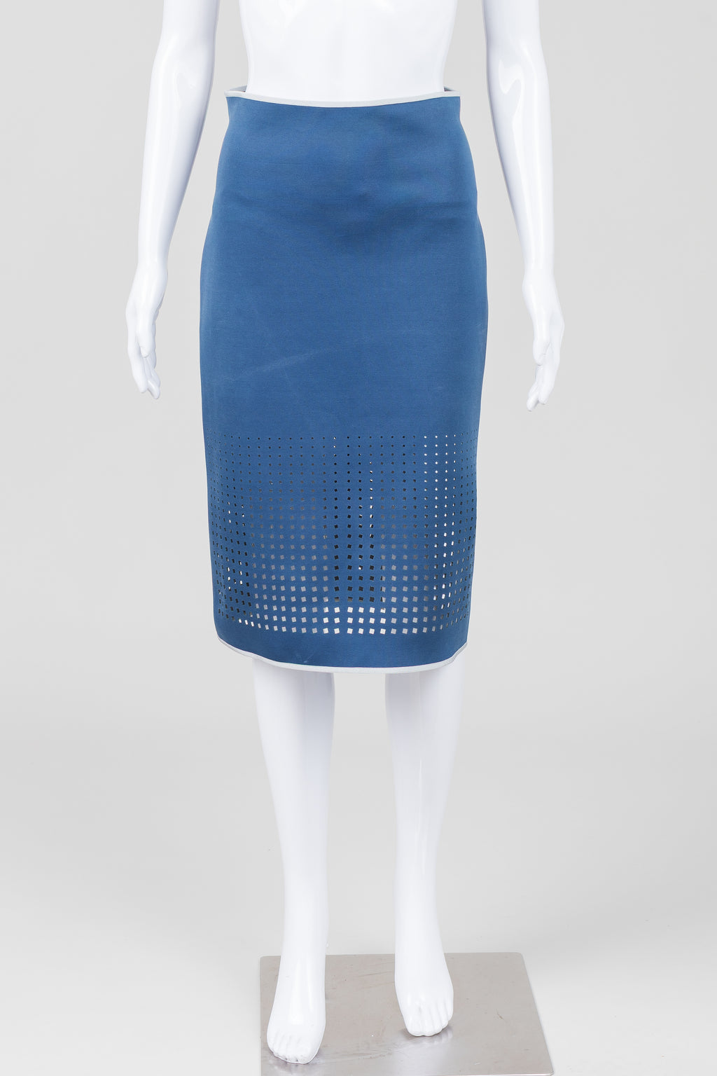Clover Canyon Steel Blue Laser Cut Neoprene Midi Skirt (M)