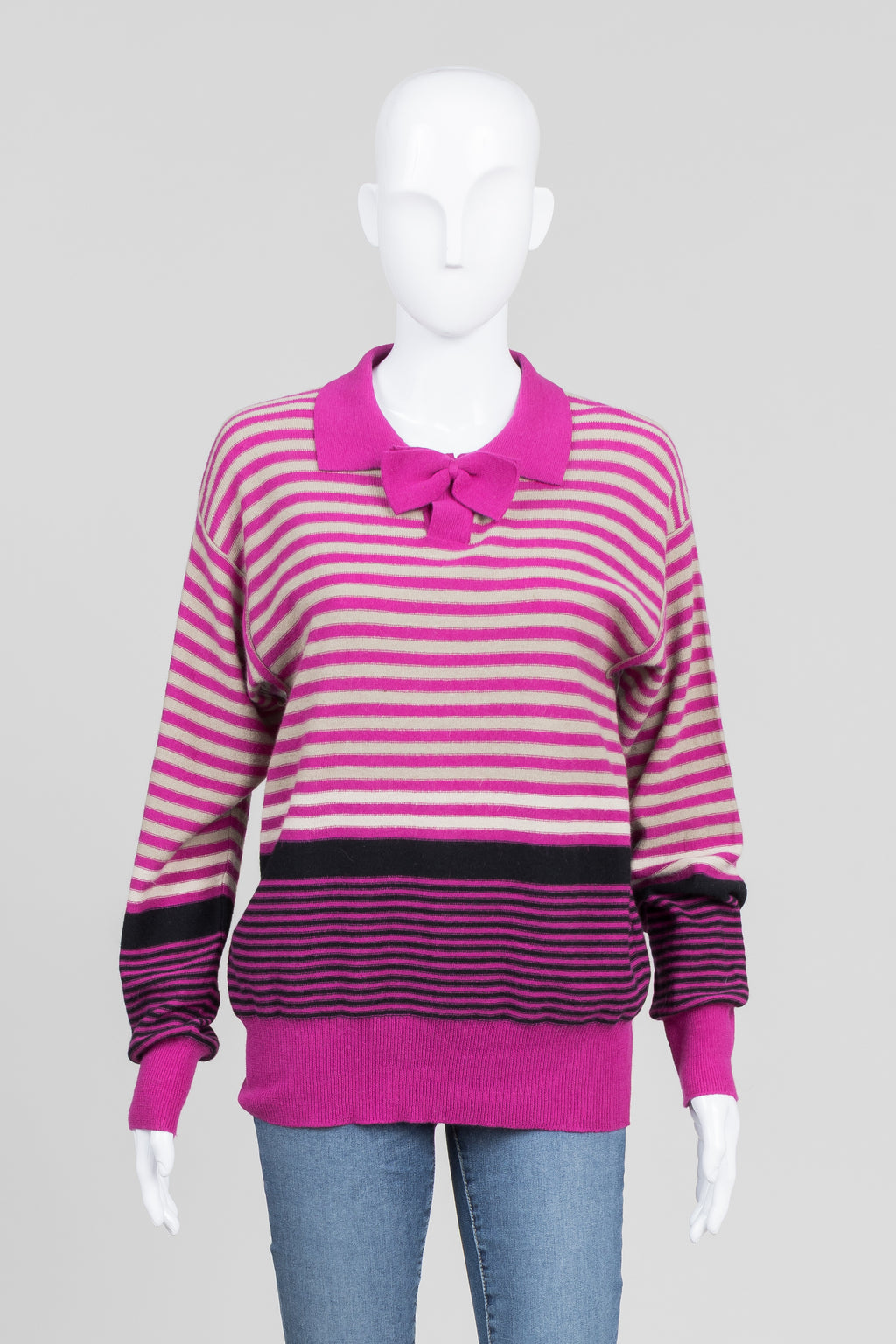 Sonia Rykiel wool/angora fuschia collared sweater with beige/black stripe motif